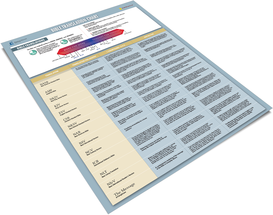 Download this helpful chart listing all the major Bible translations, their reading level, translation philosophy, and distinctives.